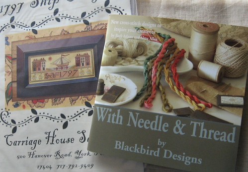 Before everything went haywire last week, I was working on adding pages featuring Carriage House Samplings design to my site, I’ve add a few to my personal stash as well. I decided silks were a must for Be My Love, I plan to stitch this on 40ct Light Espresso from R&R (it is hard to see in the photo). I also would like to stitch the 1797 Ship Sampler for the boys/guest bathroom, I don’t have anything stitched in that room at all.